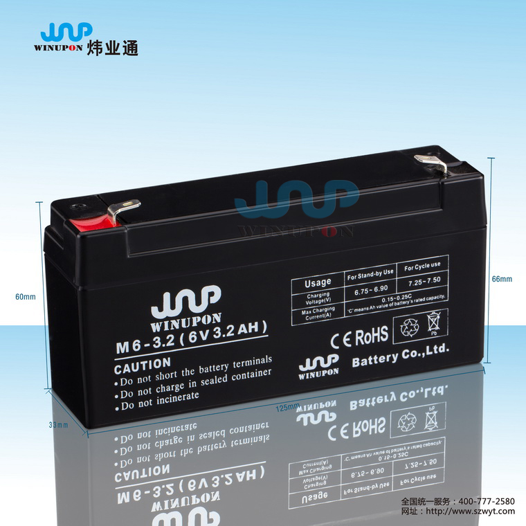 | 規(guī)格型號 | 6V3.2AH | 外形尺寸(±2mm) | 約重0.60KG | |||
