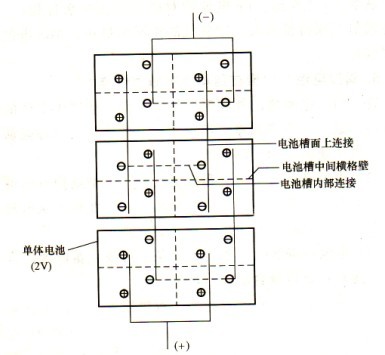 (4)閥控電池正常密封狀態(tài),散熱較差。在浮充狀態(tài)電池內(nèi)為負(fù)壓,所以電池槽壁要加厚,對2000~3000Ah電池槽的厚度有10mm以上。然而厚度越厚,熱容量越大,越難散熱,這樣將影響電池的電氣性能。因而有些制造廠采用分開槽的方法來分散槽壁負(fù)壓,以達(dá)到減薄壁厚便于散熱的目的。如將l000Ah電池分成兩格,2000~3000Ah電池分成四格。各槽格極板相互并聯(lián),這樣2000~3000Ah槽厚可減至8~8.5mm。單體電池的電池槽采用分開方式,其串聯(lián)組合方式可用圖1-4表示。