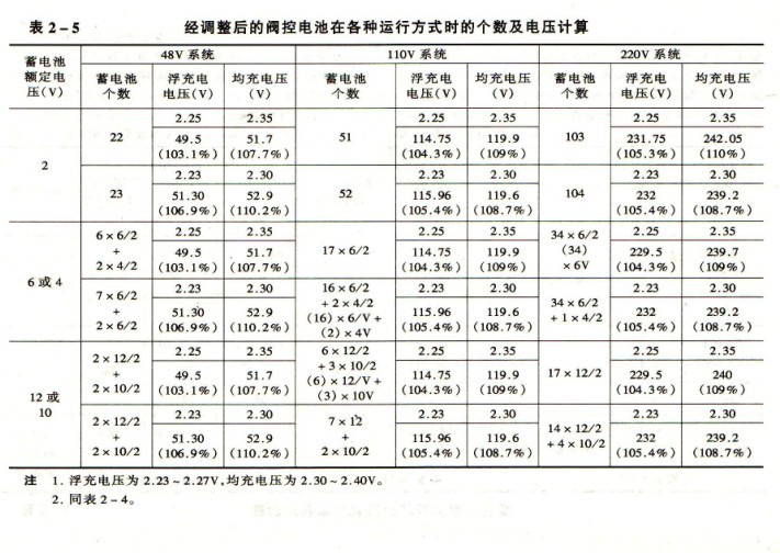 (2)蓄電池的個數(shù)均少于一般鉛酸蓄電池個數(shù),對減少安裝與試驗工作、減少工程投資都較有利。根據(jù)表2-4,每個電池浮充電壓按2.25V,均衡充電電壓2.35V計算。母線電壓有個別情況要求偏移電壓范圍較大。為此,可將浮充電電壓作少量增減,對均充電壓由2.35V降至2.30V,均充時間可能略為延長一些。據(jù)一些電池廠試驗,延長2~3h,即可達到均衡充電要求。經(jīng)調(diào)整后的電池個數(shù)與電壓的計算,見表2-5。
