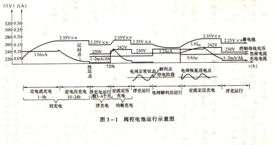 閥控電池組完成初充電后,即可轉(zhuǎn)為浮充電方式運(yùn)行。對(duì)于變(配)電所只有一組蓄電池時(shí),浮充電就是充電裝置首先應(yīng)滿足直流負(fù)荷的要求,另外還要以小電流滿足電內(nèi)部的自放電要求。所以浮充電電流值等于直流負(fù)荷電流+浮充電流。浮充電補(bǔ)償電池內(nèi)部的自放電和外殼表面臟污后所產(chǎn)生的爬電損失。除直流負(fù)荷電流外,真正充進(jìn)電池內(nèi)