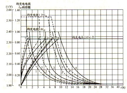 圖4-3 閥控電池不同均充電流在2.35V/個(gè)均充電壓時(shí)的充電特性(25℃)曲線 1一放電深度20%Cl0;2放電深度50%cl0;3一放電深度80%Cl0;4一放電深度100%Cl0;細(xì)實(shí)線一充電電流l Ol。;細(xì)虛線 充電電流1.25,l0;粗實(shí)線一電壓曲線;細(xì)實(shí)線一電流曲線