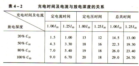 在充電過程中,電池電流在充電前期恒定不變(根據(jù)放電深度不一樣,時(shí)間有所不同,如1.0I10時(shí),放電深度為 100%Cl0,時(shí)間為9h;1.25I10時(shí),同樣放電深度為l00%,時(shí)間為7h),即保持電流l.0I10。蓄電池的端電壓逐漸上升至2.35V/個(gè)之后,充電電壓恒定不變。此時(shí)充電電流按指數(shù)規(guī)律迅速衰減,在10~20h內(nèi)電流衰減速率變慢,充電結(jié)束前幾小時(shí)起,電流不再改變。從圖4—3可看出,充電電流提高時(shí),充電時(shí)間可以縮短,而整個(gè)充電結(jié)束時(shí)問相差不多,見表4—2。