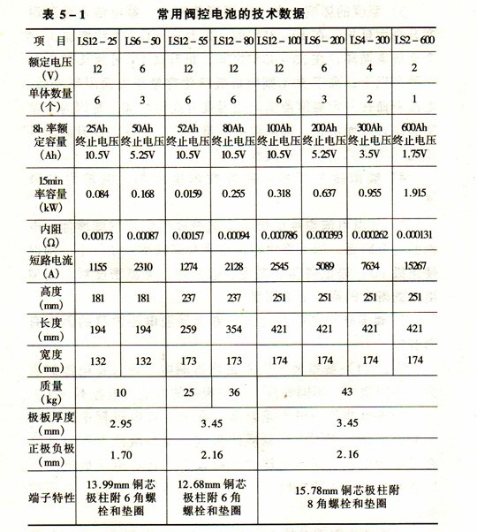 電池的內(nèi)阻就單體電池而言,主要由電解液、隔板和極板本身(極柵及活性物質(zhì))構(gòu)成。就電池組而言,單體電池之間的連接,以及極柱都是構(gòu)成電阻的重要部分,需進(jìn)行電壓降的計(jì)算。有時(shí)為了減小電壓降的損失,而采用銅芯鍍鉛的極柱。常用閥控電池的技術(shù)數(shù)據(jù)見(jiàn)表5—1。