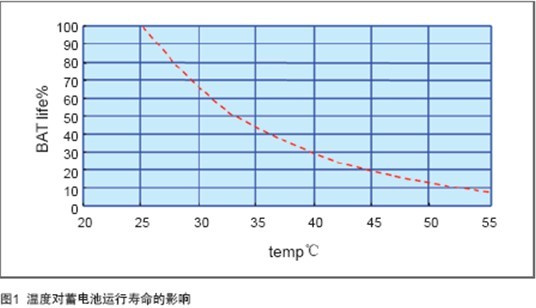 失水的途徑比較多:節(jié)流閥設計不合理,頻繁開啟;電源對蓄電池頻繁均充;環(huán)境溫度過高。其中高溫是最主要的因素,高溫會加速蓄電池失水速度,導致蓄電池容量下降。以25℃為基準,當蓄電池運行環(huán)境上升10℃,壽命減少50%,如圖1所示。