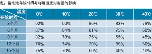 蓄電池在存放過程中存在自放電,如果長時間得不到補充,就會出現硫酸鹽化現象。這種現象如果沒有得到及時改善,蓄電池容量會降低甚至損壞不能使用。蓄電池在存貯過程中,環(huán)境溫度對容量影響也非常大,如表2所示。
